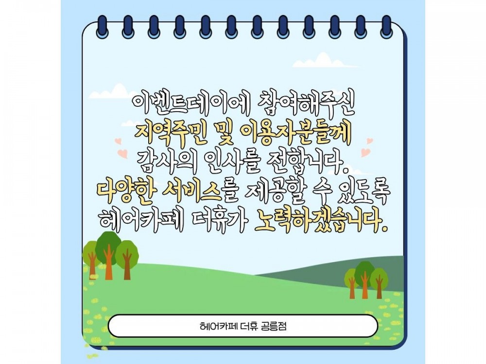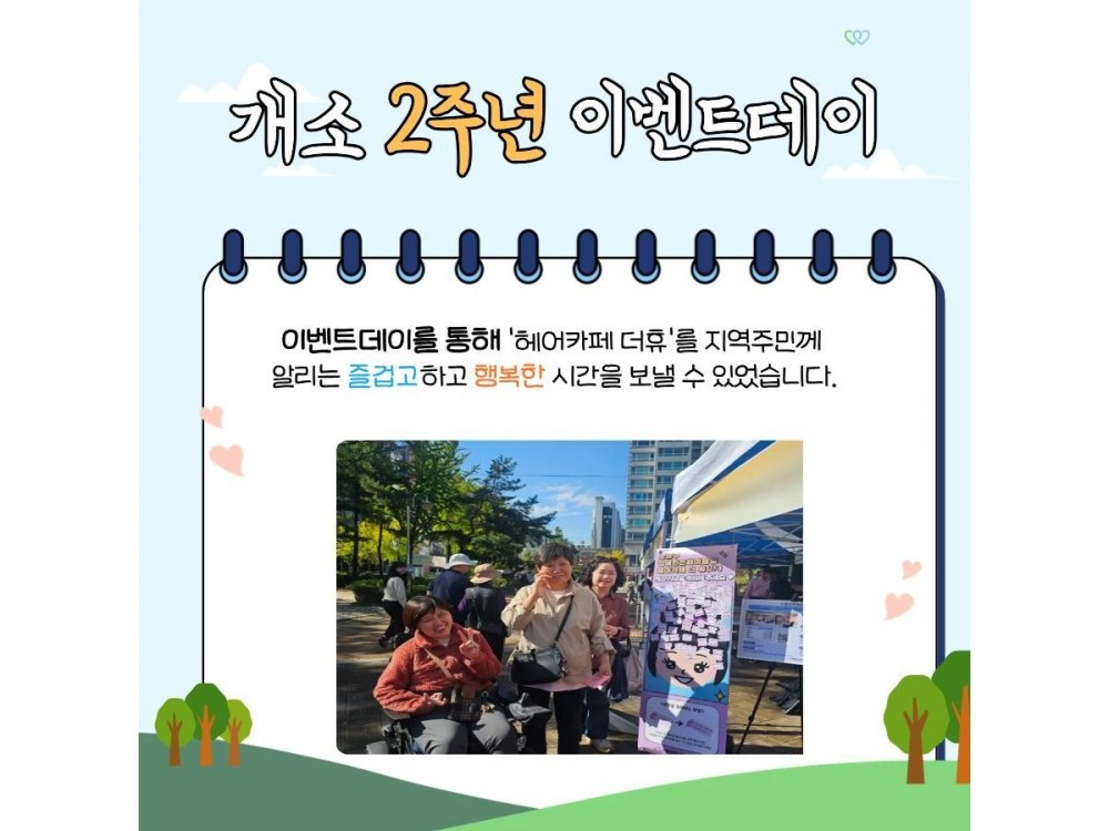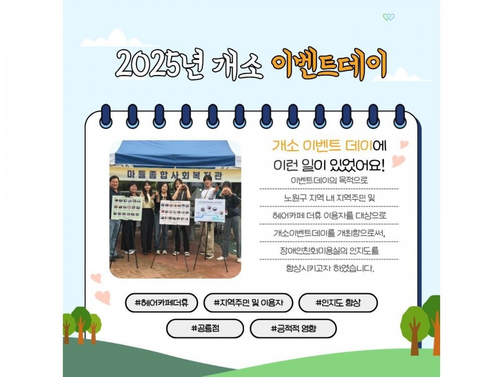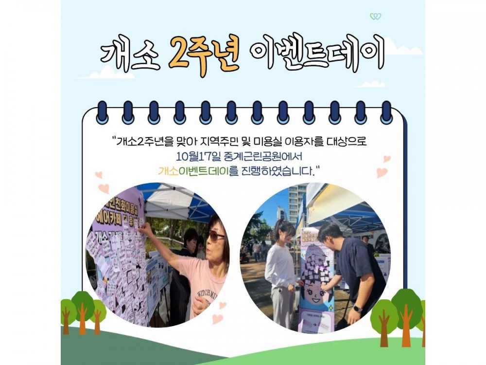 장애인친화미용실(공릉점) 개소2주년 이벤트데이 페이지 정보 작성자 시설운영팀 작성일25-10-24 00:20 조회18회 댓글0건 관련링크 이전글 다음글 목록 본문 댓글목록 등록된 댓글이 없습니다. 이전글 다음글 목록