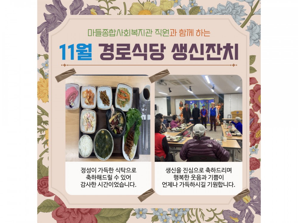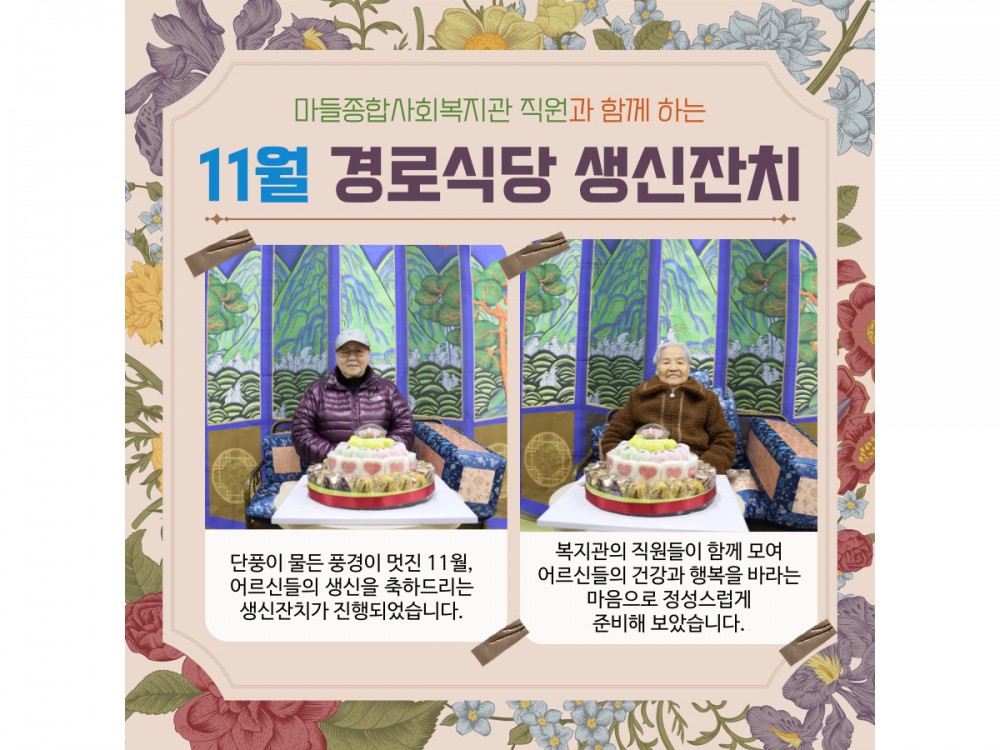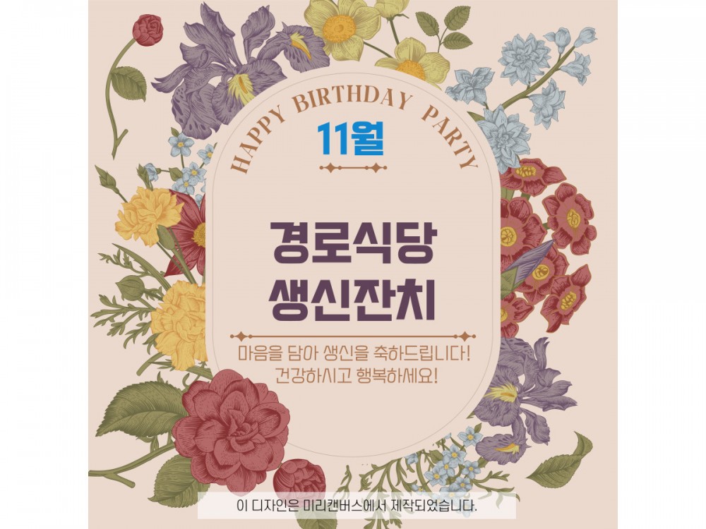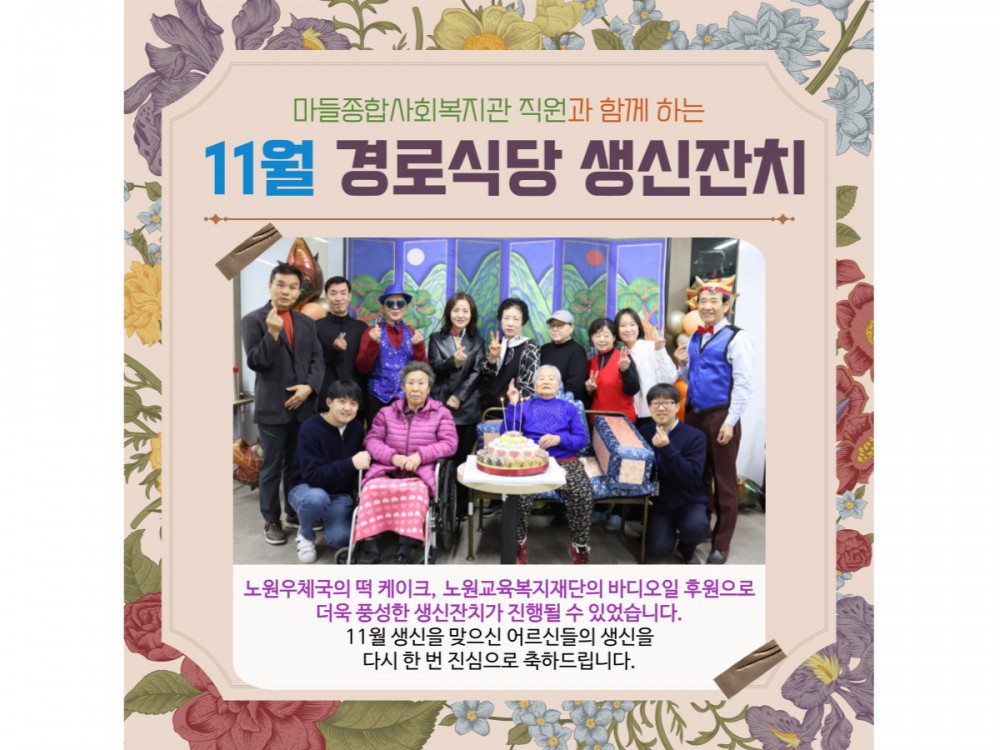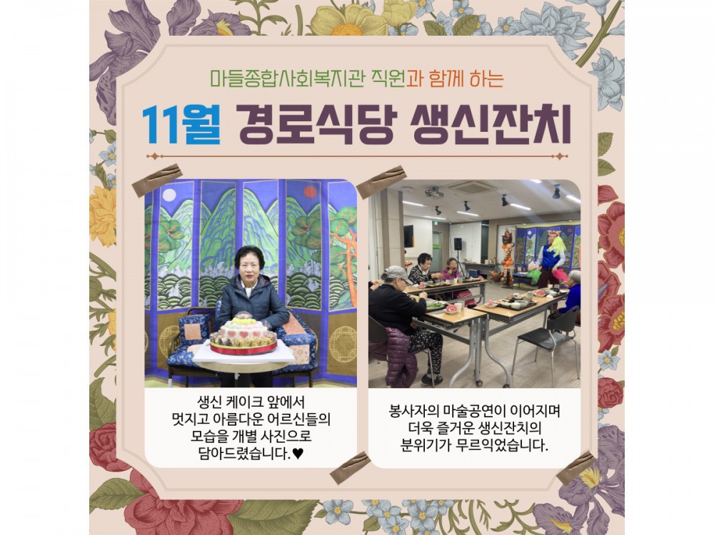 11월 경로식당 생신잔치 "함께라서 더 행복한 생일" 페이지 정보 작성자 서비스팀 작성일25-11-20 20:37 조회140회 댓글0건 관련링크 이전글 다음글 목록 본문 * 이 디자인은 미리캔버스에서 작업되었습니다.(https://www.miricanvas.com) 댓글목록 등록된 댓글이 없습니다. 이전글 다음글 목록