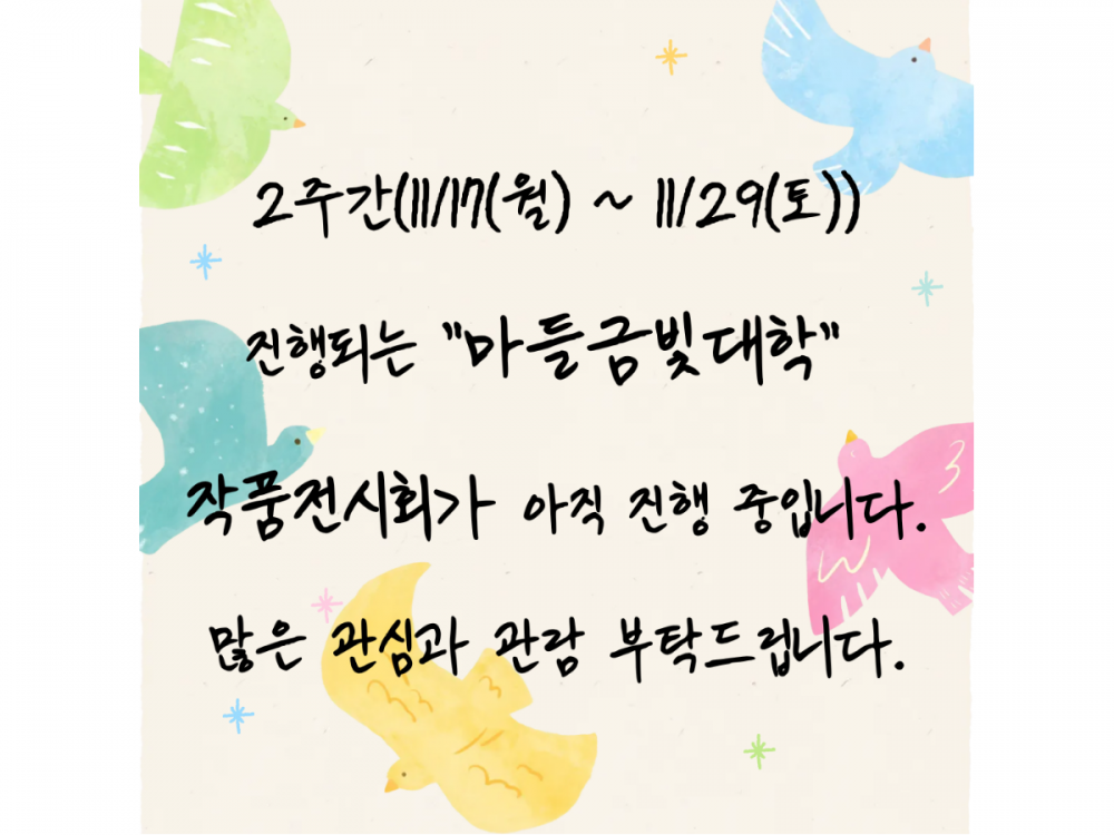 2025년 여가문화사업 "마들금빛대학" 작품전시회 페이지 정보 작성자 서비스팀 작성일25-11-21 17:55 조회153회 댓글0건 관련링크 이전글 다음글 목록 본문 * 이 디자인은 미리캔버스에서 작업되었습니다. (https://www.miricanvas.com) 댓글목록 등록된 댓글이 없습니다. 이전글 다음글 목록