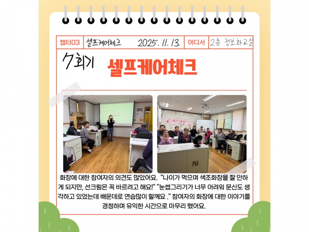 행복헤어 11월활동 페이지 정보 작성자 시설운영팀 작성일25-11-14 08:19 조회142회 댓글0건 관련링크 이전글 다음글 목록 본문 #단풍 #추석 #명절* 이 디자인은 미리캔버스에서 작업되었습니다.(https://www.miricanvas.com) 댓글목록 등록된 댓글이 없습니다. 이전글 다음글 목록