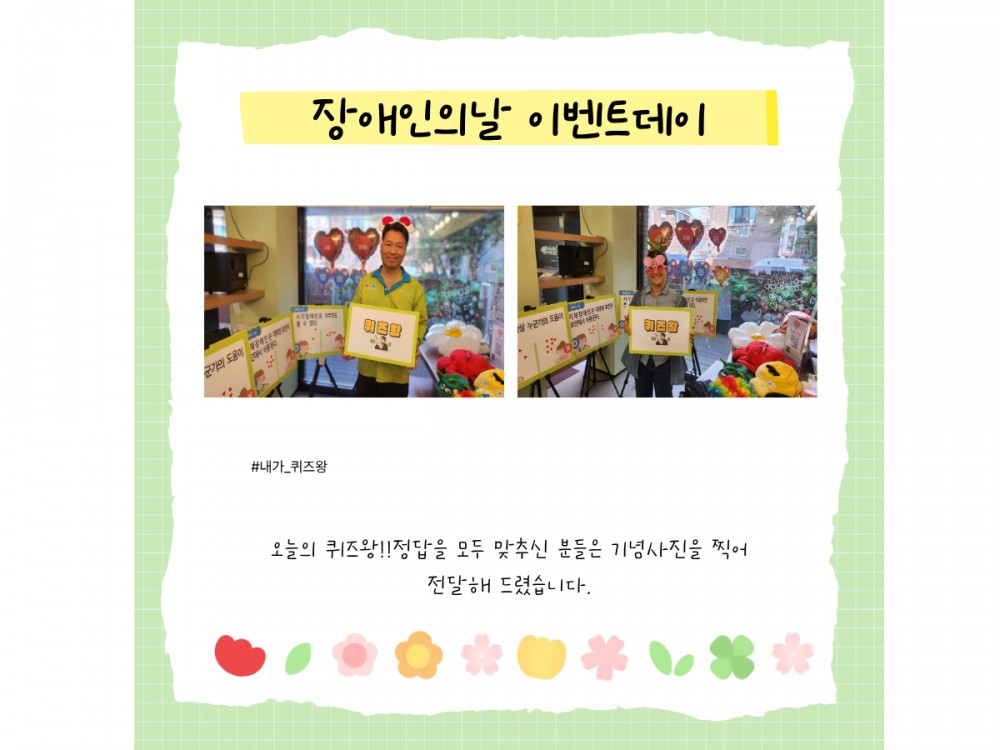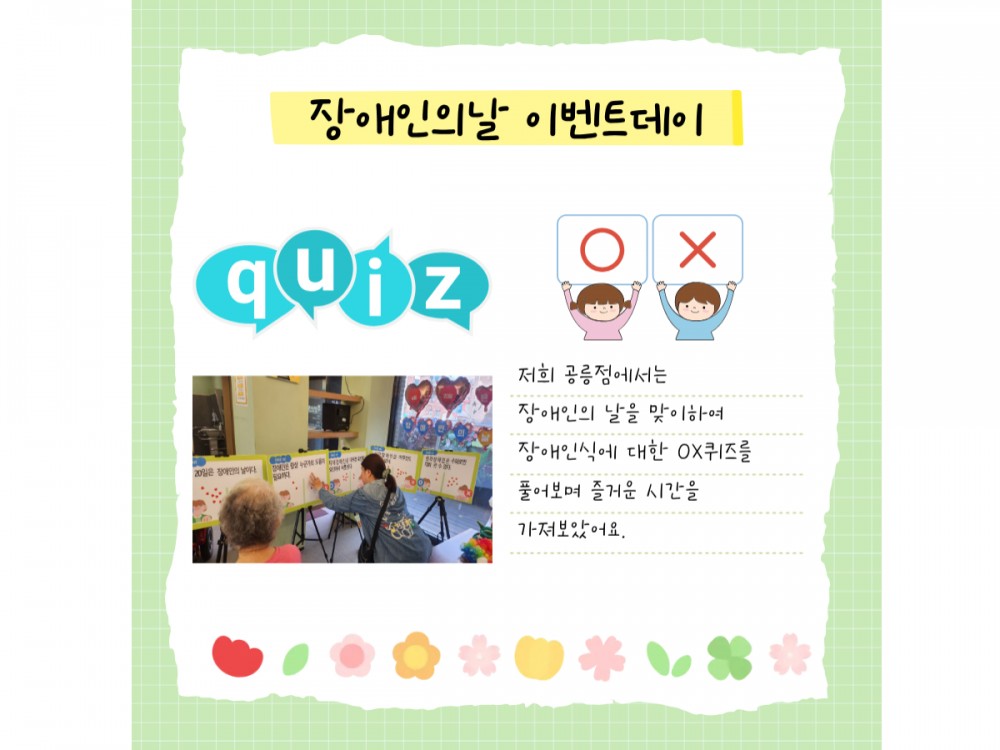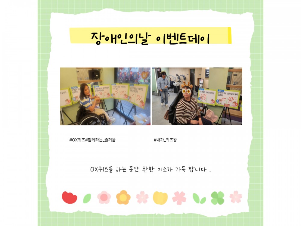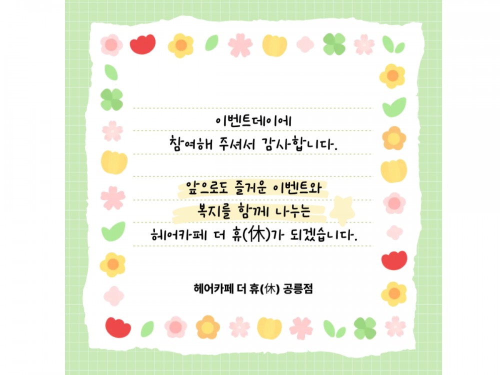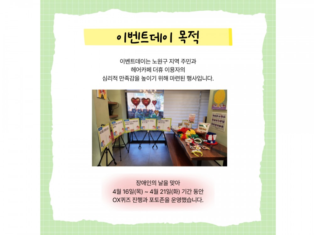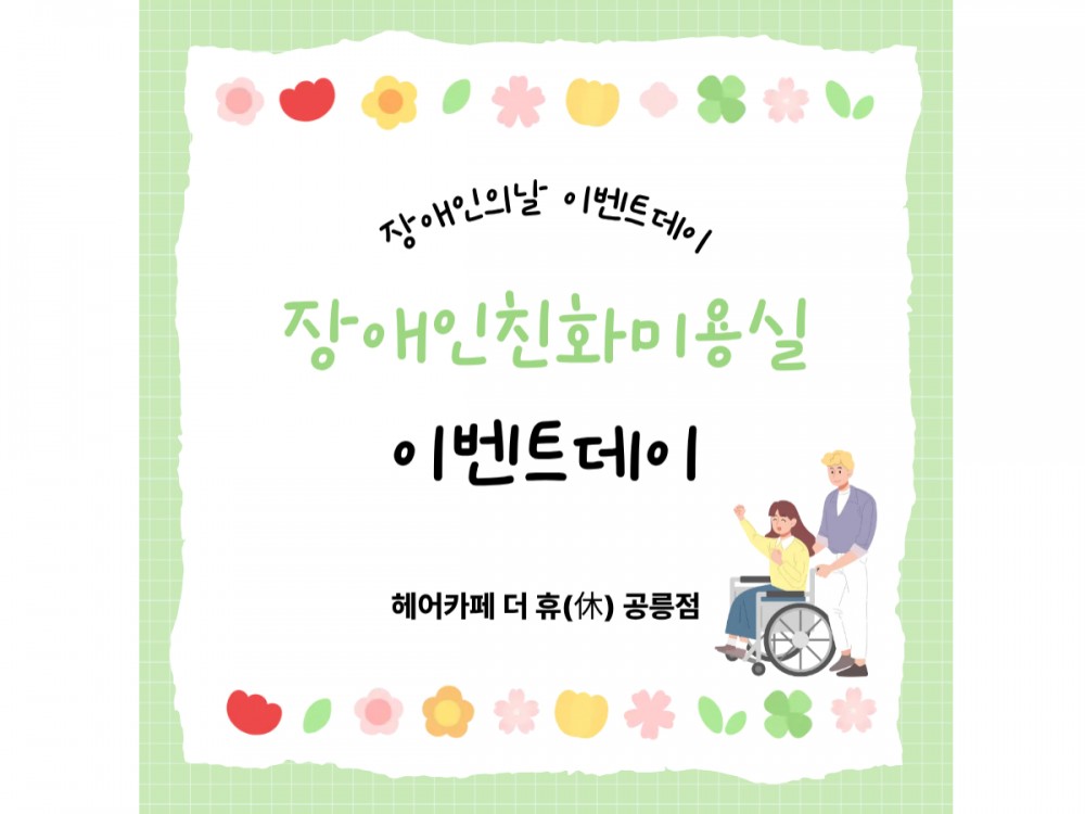 장애인친화미용실(공릉점) 장애인의 날 이벤트데이 페이지 정보 작성자 시설운영팀 작성일26-04-24 16:09 조회5회 댓글0건 관련링크 이전글 다음글 목록 본문 #벚꽃 명소 #미세먼지 #한강* 이 디자인은 미리캔버스에서 작업되었습니다.(https://www.miricanvas.com) 댓글목록 등록된 댓글이 없습니다. 이전글 다음글 목록