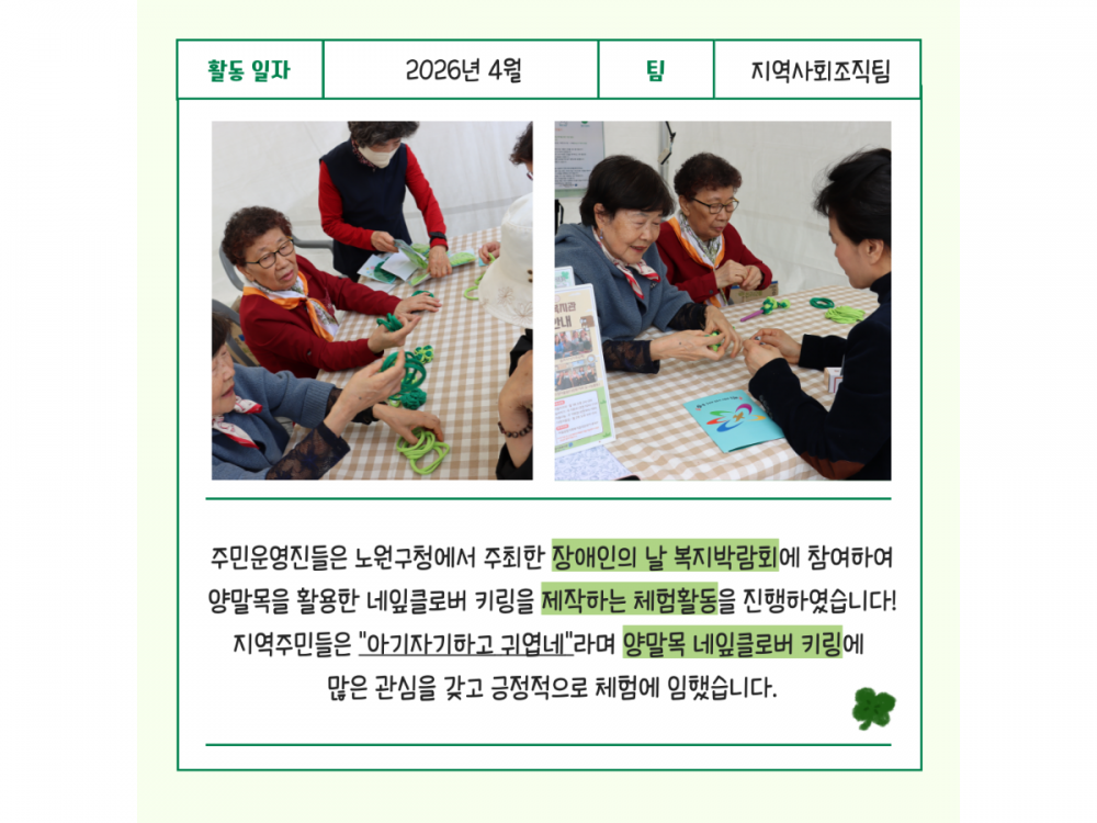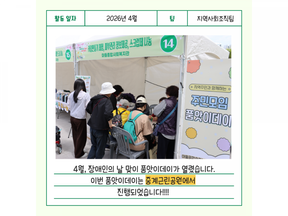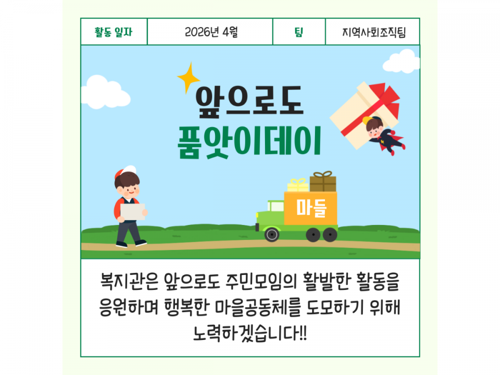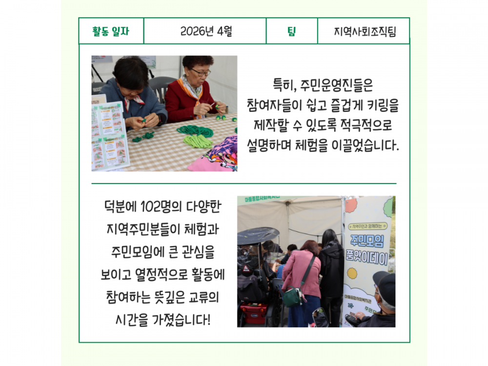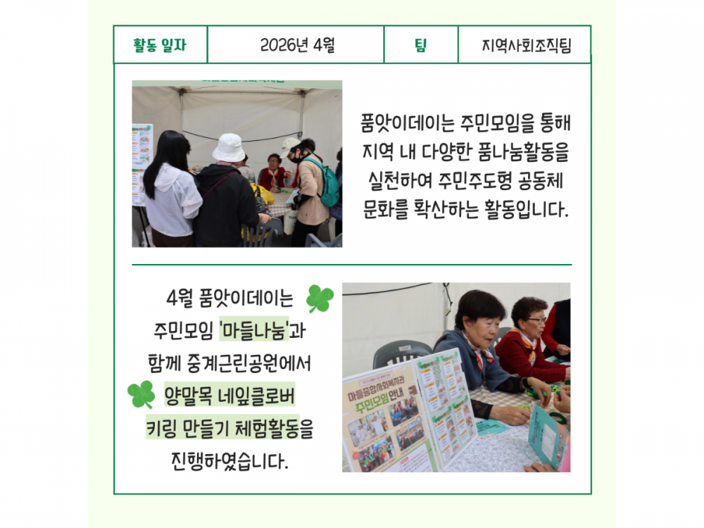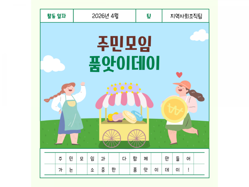 4월 주민모임 품앗이데이 활동 페이지 정보 작성자 지역사회조직팀 작성일26-04-27 15:22 조회9회 댓글0건 관련링크 다음글 목록 본문 #벚꽃 명소 #미세먼지 #한강* 이 디자인은 미리캔버스에서 작업되었습니다.(https://www.miricanvas.com) 댓글목록 등록된 댓글이 없습니다. 다음글 목록