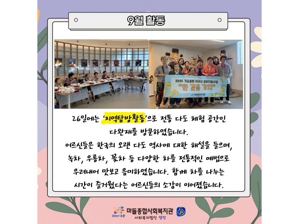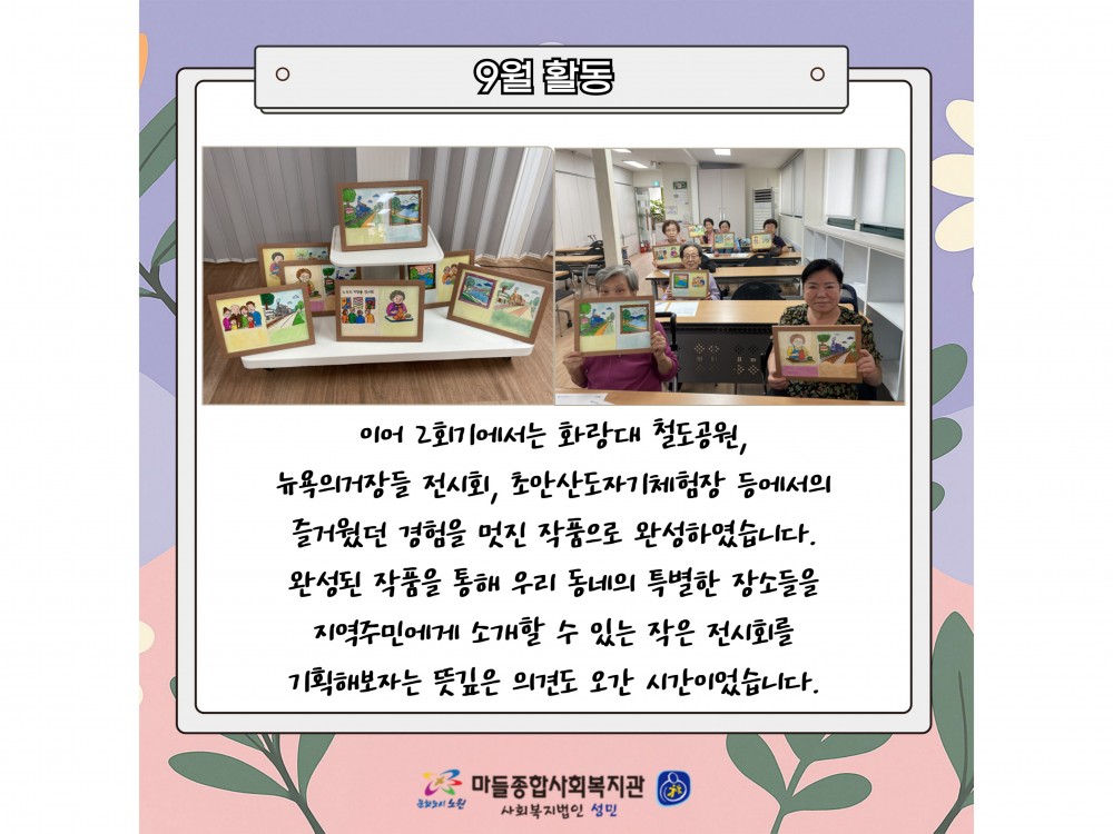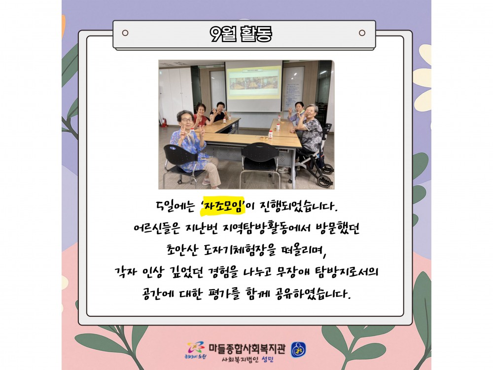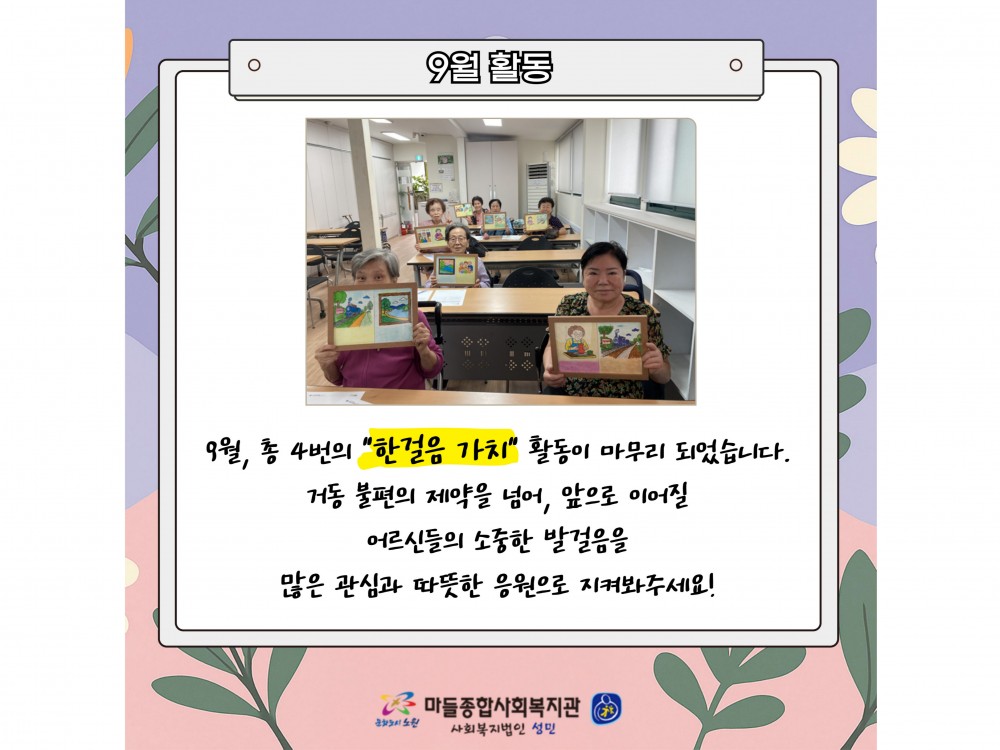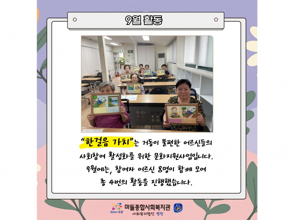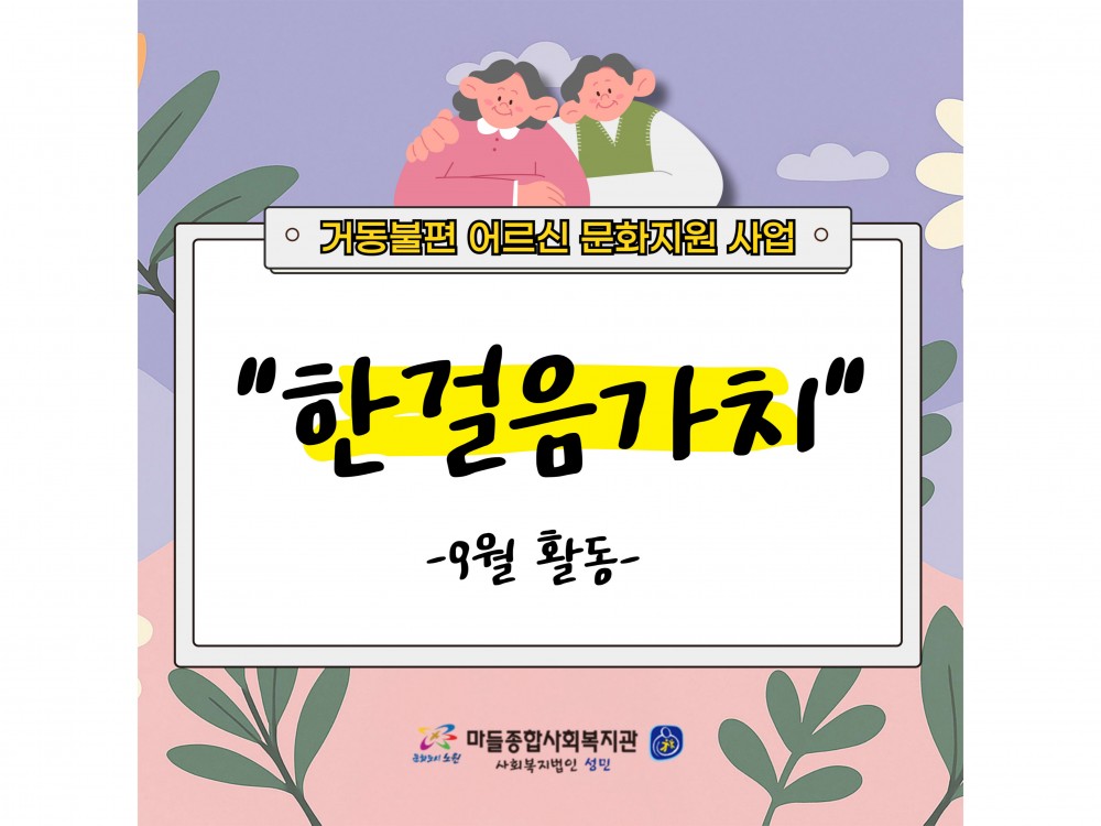 거동불편어르신 문화지원사업 '한걸음가치' 9월 활동 페이지 정보 작성자 서비스1팀 작성일25-09-30 19:37 조회65회 댓글0건 관련링크 이전글 다음글 목록 본문 #단풍 #추석 #명절* 이 디자인은 미리캔버스에서 작업되었습니다.(https://www.miricanvas.com) 댓글목록 등록된 댓글이 없습니다. 이전글 다음글 목록