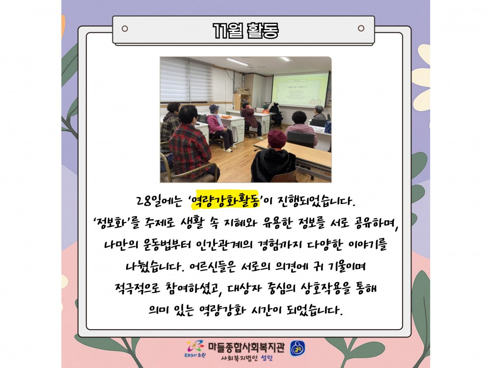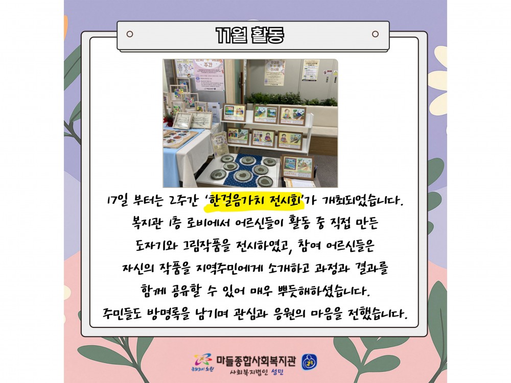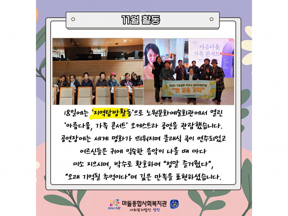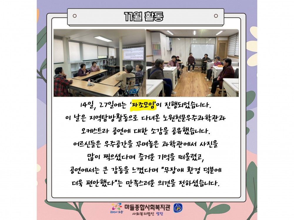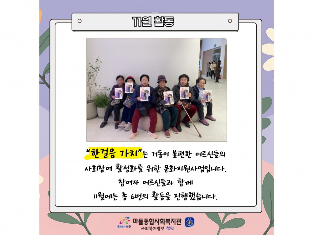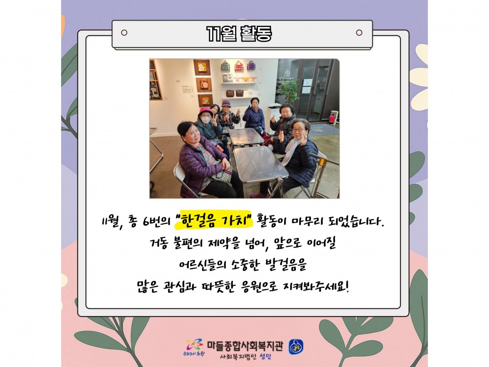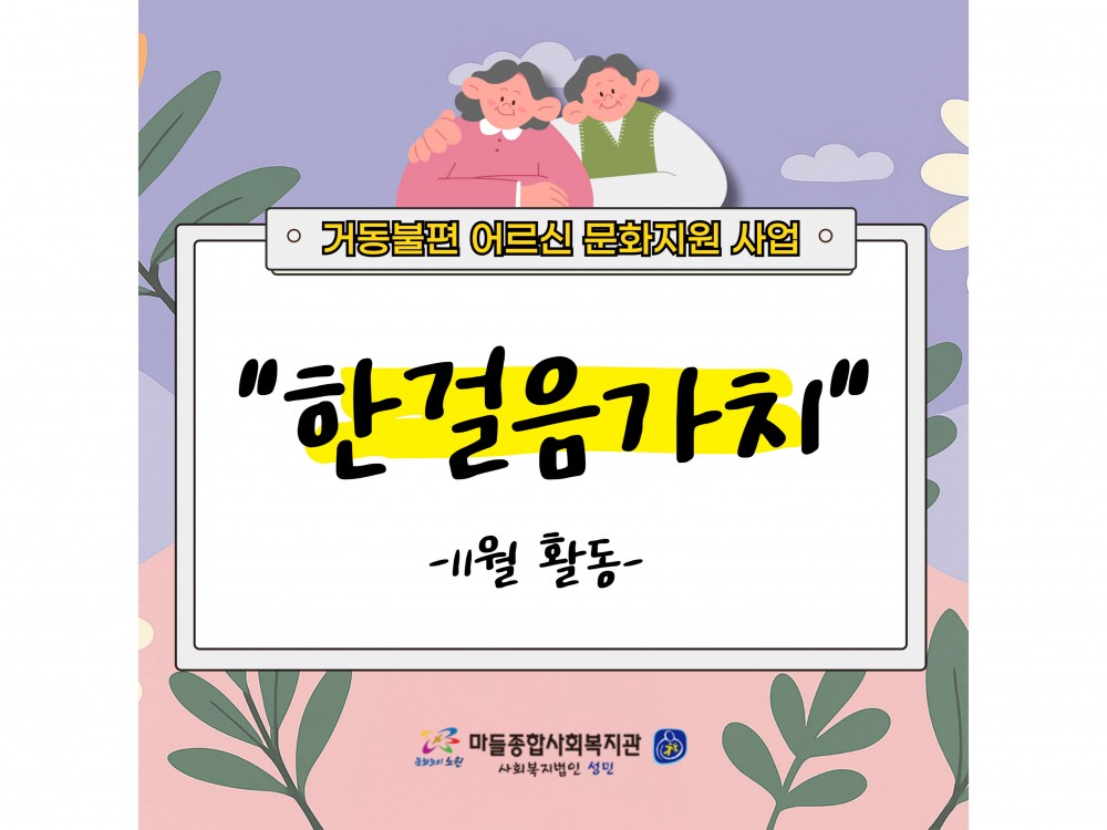 거동불편어르신 문화지원사업 '한걸음가치' 11월 활동 페이지 정보 작성자 서비스팀 작성일25-11-28 14:07 조회90회 댓글0건 관련링크 이전글 다음글 목록 본문 #크리스마스 #붕세권 #연말* 이 디자인은 미리캔버스에서 작업되었습니다.(https://www.miricanvas.com) 댓글목록 등록된 댓글이 없습니다. 이전글 다음글 목록
