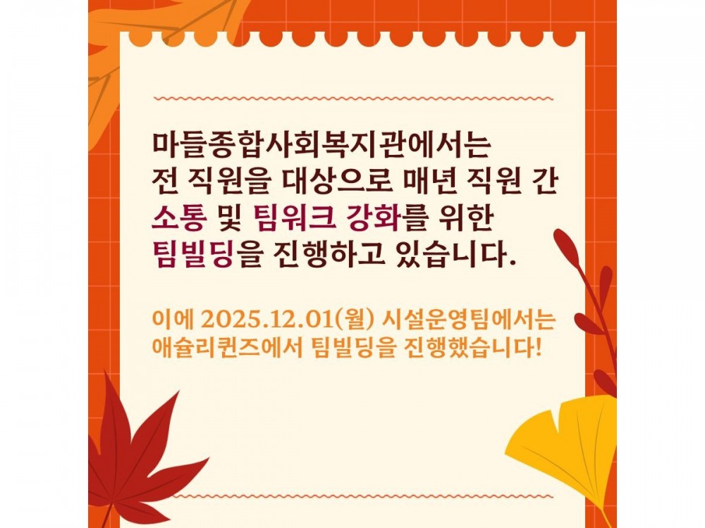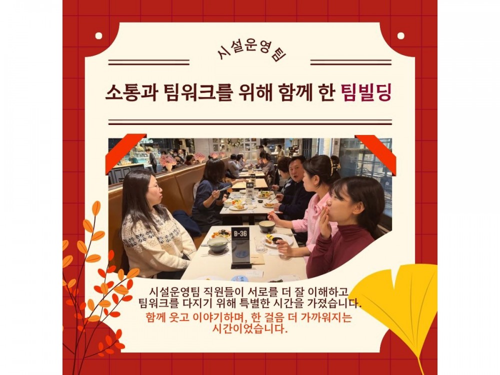 2025 시설운영팀 팀빌딩 페이지 정보 작성자 시설운영팀 작성일25-12-02 00:23 조회91회 댓글0건 관련링크 이전글 다음글 목록 본문 댓글목록 등록된 댓글이 없습니다. 이전글 다음글 목록