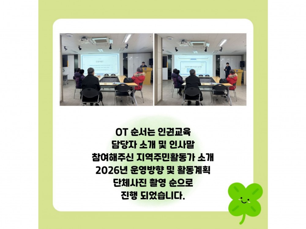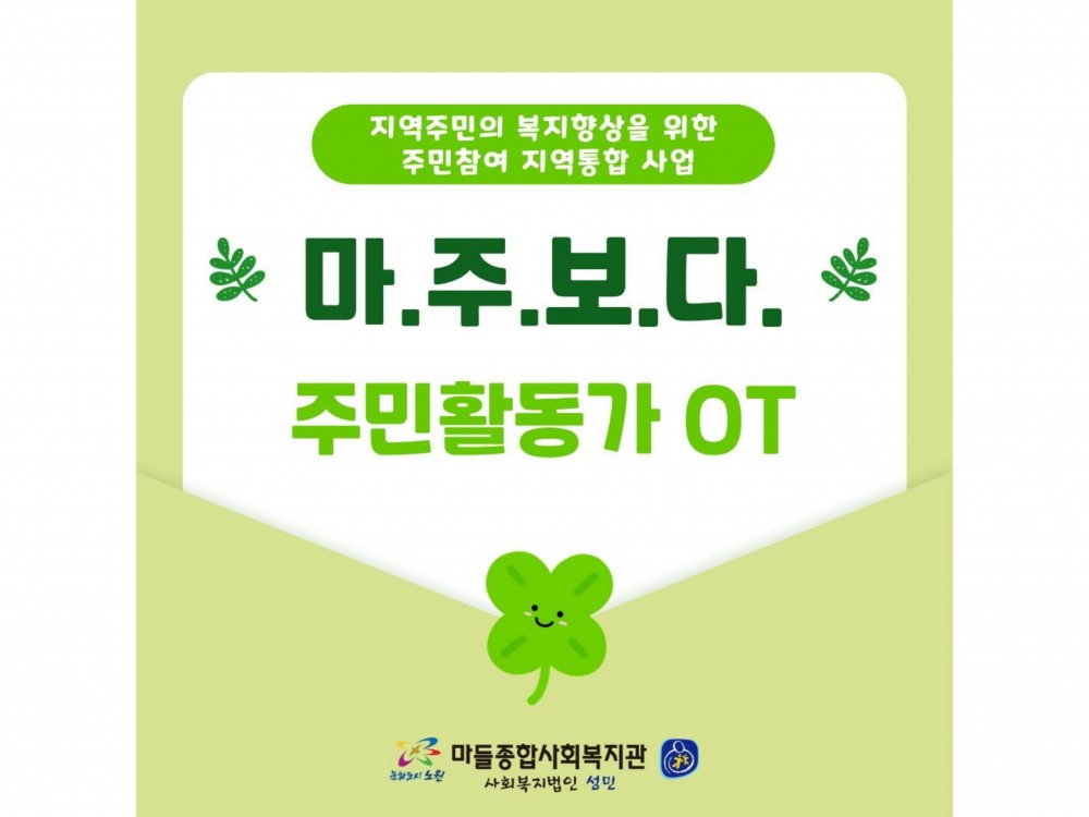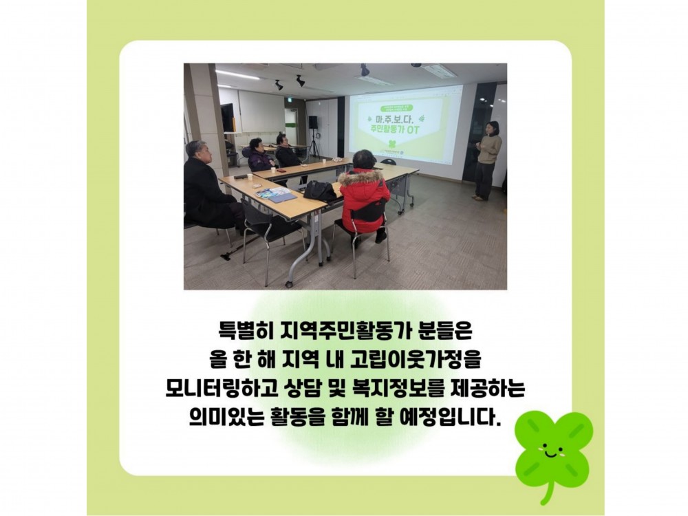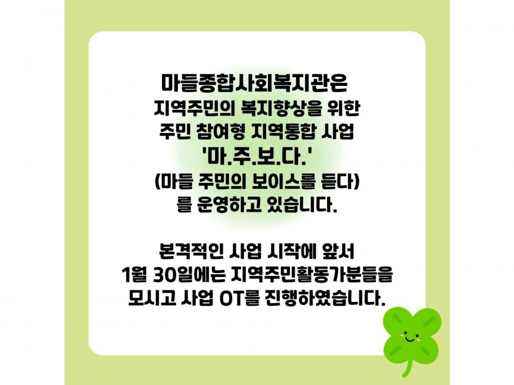2026년 지역밀착형사회복지관사업 주민활동가 OT 페이지 정보 작성자 사례지원팀 작성일26-01-30 17:44 조회45회 댓글0건 관련링크 이전글 다음글 목록 본문 #명절 #입학 #봄* 이 디자인은 미리캔버스에서 작업되었습니다.(https://www.miricanvas.com) 댓글목록 등록된 댓글이 없습니다. 이전글 다음글 목록